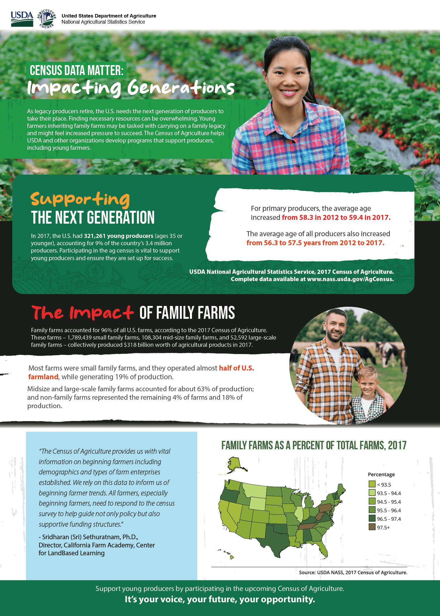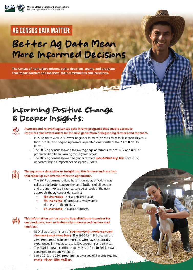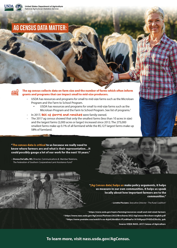 The USDA National Agricultural Statistics Service’s (NASS) quinquennial Census of Agriculture provides a close-to-complete count of the nation’s farms and ranches. The Ag Census evaluates land use, ownership, producer demographics, production processes, producer income, and expenditures – providing a main source of US agricultural data and influencing decisions that shape the future of American agriculture.