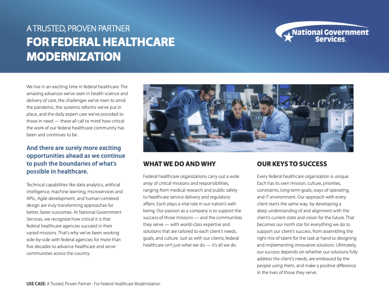A subsidiary of Elevance Health, NGS empowers federal healthcare agencies to improve communities by modernizing processes and making IT an enabler for healthcare. NGS came to Sage with a corporate brand awareness challenge. In the immediate term, the organization faced a re-compete for the highly competitive, $40 billion NITAAC CIO-SP4 contract on the horizon. Accordingly, NGS needed to elevate awareness of its health IT capabilities to compete for this key piece of business. In the long term, the company’s goal was to generate broad awareness of the breadth of its expertise and establish itself as a thought leader in federal health IT to maintain its competitive position and grow into new markets.