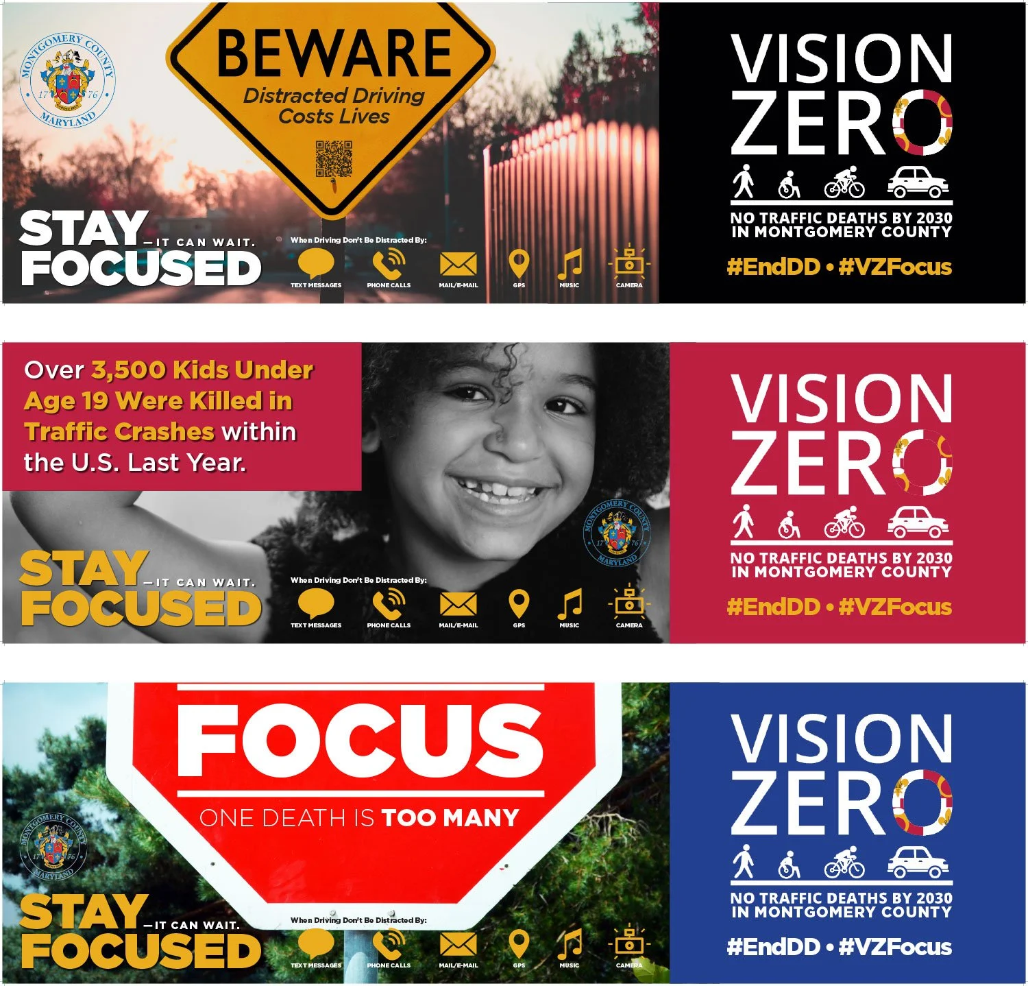 Managers of the Vision Zero Distracted Driving Program in Montgomery County, Maryland, aimed to launch a transit advertising campaign to deter drivers from texting or engaging in other distracting activities while on the road. Through an earlier task order, the county had contracted the production of bus back advertisements, so ad space was already in place.